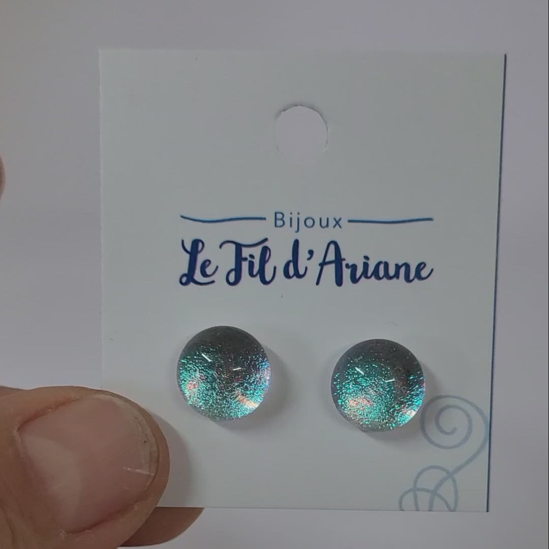 Ces puces d'oreilles en verre fusion sont d'une couleur délicate mais pétillante grâce au verre dichroïque bleu transparent. Elles apporteront un touche féminine et raffinée à ton look, en plus d'être hypoallergéniques.
